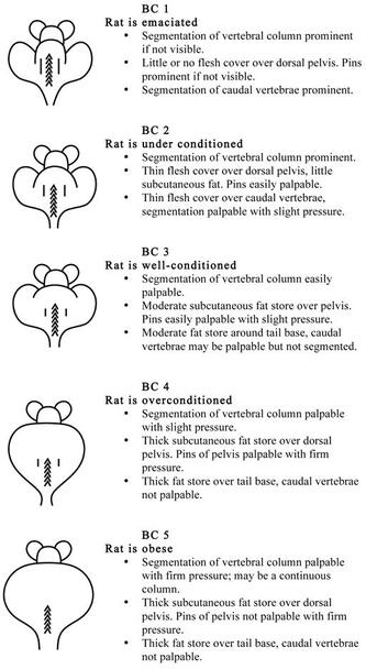 - Body Condition Scoring: A Rapid and Accurate Method for Assessing Health Status in Mice Lab Animal Science, Vol 49 (3) 319-323, 1999