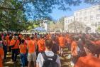A large crowd of campus community members, mostly in orange t-shirts, gathered on Agnes Benidickson Field Monday afternoon for a sacred fire, listening closely to speeches commemorating the National Day for Truth and Reconciliation.