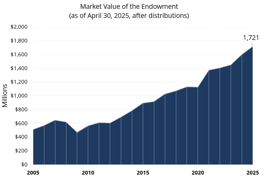 The endowment fund's payout is set annually based on the prior calendar year's ending market value. The payout for the 2025/2026 fiscal year is 17.62 cents per unit, implying a spending rate of 3.7%:
