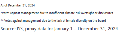 The first step in an engagement is generally a dialogue with the company to understand the issue and voice any concerns. Where the outcome of this discussion does not satisfy the portfolio manager, various escalation steps may be considered including using our proxy voting rights in support of our engagement goals. Escalation activities will be undertaken at the discretion of the portfolio manager when the issue is deemed to be material and prior engagement efforts have not been successful. Escalation strategies are determined on a case-by-case basis and may include voting against directors, collaborating with other investors, reducing exposure and complete divestment.
