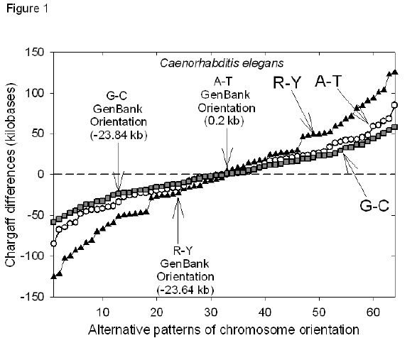Table 1  Base compositions and Chargaff differences for C. elegans chromosomes when in GenBank orientationa