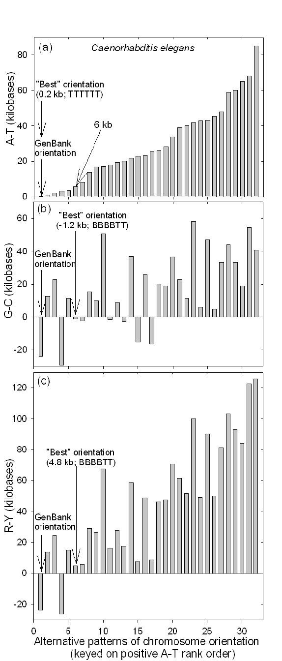 Assignment of orientation to the six chromosomes of Caenorhabditis elegans is said to have been arbitrary and, of 26 (= 64) possible combinations of top (T) and bottom (B) strands, the GenBank orientation (designated "TTTTTT") is but one. Yet, for the W bases (A and T) the chromosomes in the GenBank orientation complement to reduce the Chargaff difference (A-T) to only 200 bases (i.e. only one in 323658 bases does not have a potential Watson-Crick pairing partner). This suggests that the assignment was not arbitrary. However, the GenBank orientation for the S bases (G and C) allows an approach to even parity less well than many other orientations, the best of which is BBBBTT (indicating a disparity between the GenBank orientations of the first 4 autosomes and those of chromosomes V and X).