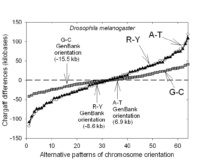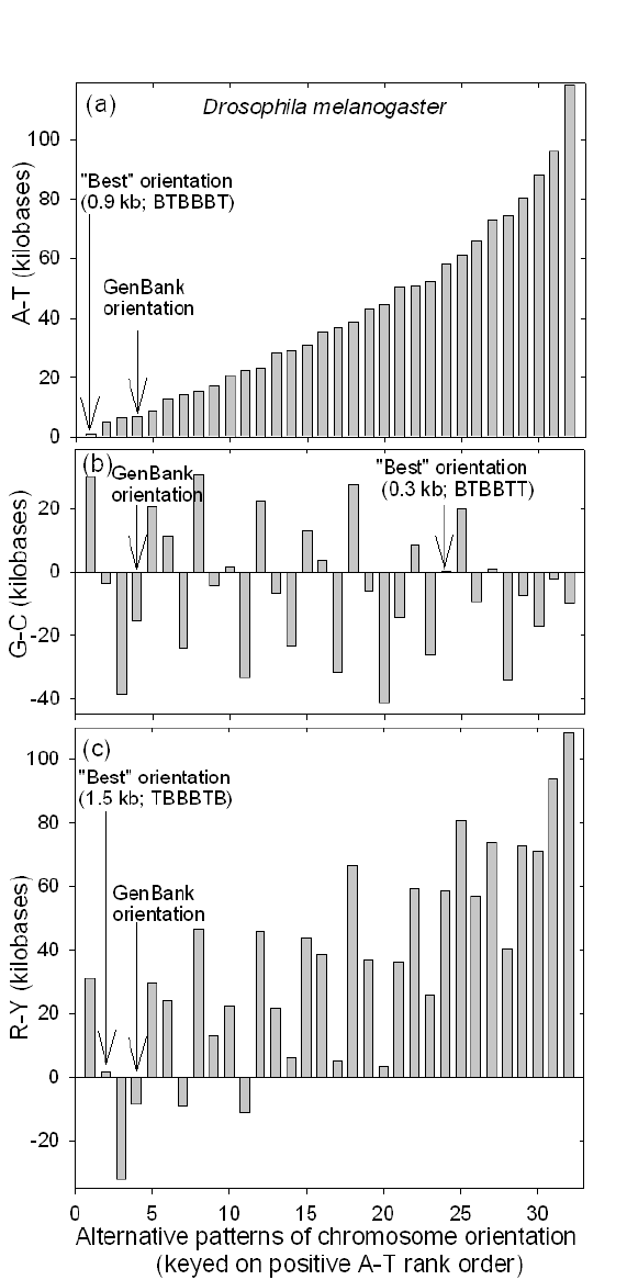Given a set of numbers that can be assigned either positive or negative values, the sum of the numbers should be minimizable by appropriate choice of positive or negative assignments. Thus, the fact that, given a set of chromosomes that are apparently randomly orientated, one can find an orientation pattern that diminishes their collective Chargaff differences should not be surprising. However, it is remarkable that six AT Chargaff differences, with absolute values varying between 8.4 kb and 21.1kb, should be minimizable to only 0.2 kb (Table 1). The case that this reflects the operation of some form of whole-genome accounting would be strengthened if the orientations assigned from Chargaff difference values could be related, in a consistent fashion, to some other polar aspect of chromosomes (e.g. acentric centromeres, and defined p and q chromosomal arms). That the assignment of orientations to the holocentric C. elegans chromosomes22-24 was really arbitrary, is brought into question by our observations that the GenBank orientation turns out to be the best orientation as far as maintaining even parity for the W base pair (P = 0.031), although reassignment was required for chromosomes V and X for the S base pair (Table 1; Figs. 1, 2). In D. melanogaster the best orientation for the W base pair requires at least two reorientations (Fig. 4a), and for the S base pair three reorientations (Fig. 4b). Yet, even with sequencing uncertainties, the W base GenBank orientation is not far removed from the best orientation.