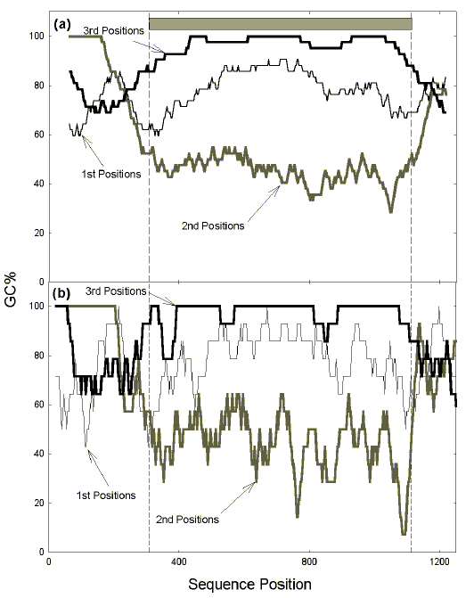 As shown in Figure 1, although each codon position is relatively uniform in its average GC% value within a gene, different codon positions within a gene have different average GC% values. It has been observed that this codon position differentiation is evident both when genes within a genome are compared, and when genomes within a phylogenetic group are compared [5, 29].