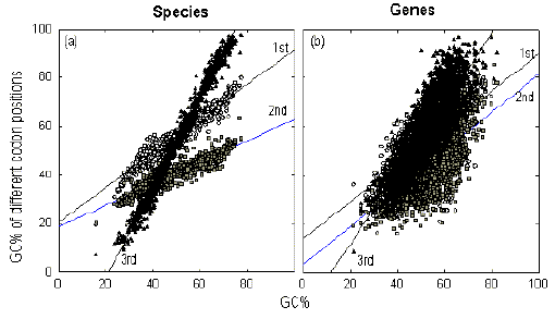 Figure 2a shows a plot of average GC% values of different codon positions of the set of available gene sequences from each of 898 prokaryotic species against the average genomic GC% of that species [21]. As has been shown for a smaller number of species [22], the slope for the second codon position, which is most constrained by the need to specify amino acids, is lowest. The slope for the third codon position, which is least constrained by the need to specify amino acids, is greatest. Similar plots are obtained with various eukaryotic groups. Thus, for the set of sequenced genes of a species, the third codon position appears to amplify either a low genomic GC% by exceeding the first and second codon positions in its AT-richness, or a high genomic GC% by exceeding the first and second codon positions in its GC-richness. This result might be viewed as consistent with each genome being a collection of genes within a region of relatively uniform GC%. However, almost identical patterns of regression lines are obtained when the GC% values of individual genes within a genome, be it prokaryotic or eukaryotic, are plotted. Thus, whereas in Figure 2a each point represents a species within a phylogenetic group, the same result is obtained when each point represents a gene within a species (Figure 2b). This led Wada et al. in 1991 [29], and others [5], to describe the plots as "universal" suggesting that the constraints operating on the three codon positions "must have general biological meanings in relation to the DNA/RNA and protein functions." |