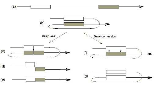 Further evidence for a relationship between GC% and recombination arose from studies of duplicate genes in eukaryotes. Based on sequence similarities, genes are sometimes considered to have arisen by the intragenomic duplication of a single ancestral gene. The duplicates may then undergo either concerted or divergent evolution. When the duplicates differ little in sequence (and hence, function; e.g. rRNA genes) then recombination-mediated gene conversion is held to assist the maintenance of sequence uniformity (concerted evolution). The survival of the duplicate is maintained by natural selection if such duplication is advantageous (e.g. the organism can more readily respond to demands for large quantities of gene product). However, the survival of the duplicate is always at risk since intragenic recombination between paralogues might eliminated one copy (copy-loss; Fig. 3). When functional differentiation of a duplicate is necessary for it to be selected (divergent evolution), there is the danger that, before natural selection can operate, recombination-mediated gene conversion will reverse any incipient differentiation, or intragenic recombination between paralogues will result in copy-loss.