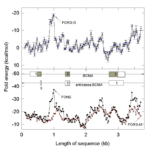 | Fig. 1. Folding energy minimization values (FONS, FORS-M; lower) and differences (FORS-D; upper) for the top strand of the 3802 nt gene (BCMA) encoding human B cell maturation protein (GenBank accession number Z29574). The overlapping gene in the bottom strand encodes a putative 115 amino acid protein. Exons are shown as numbered boxes with regions encoding the BCMA protein in grey. Horizontal arrows indicate transcription directions. Each data point corresponds to the middle of a 200 nt sequence window. |