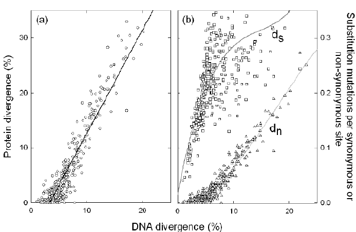 Fig. 2. Divergence between 9390 orthologous genes of mouse and rat. For each open reading frame is shown (a) a direct plot of dn against ds, and (b) independent plots of ds (squares) and dn (triangles) against their sum (as a measure of overall DNA divergence). In (a) the first order regression line intercepts the X-axis at a value of 0.044, which is significantly different from zero (P < 0.0001).  The correlation coefficient was 0.46, and average values for dn and ds were 0.04 and 0.22, respectively. In another study of 470 orthologues, the correlation coefficient was 0.54 , with respective average values of 0.035 and 0.164.52 In (b) the same data are plotted with second order regression lines. This, with permission, is a replot of data of Bazykin et al..51