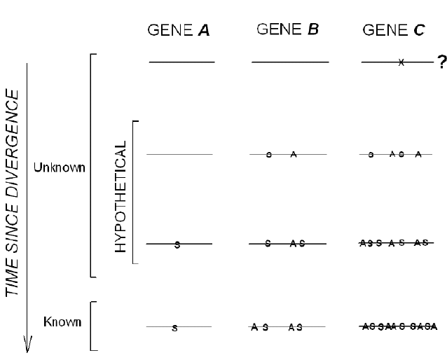 Fig. 3. Were the first mutations (X) associated with the mouse-rat divergence synonymous (S) or amino acid-changing (A; non-synonymous)? Genes A, B and C have low, intermediate, and high mutation rates, respectively. This is inferred from the number of known substitutions that distinguish the modern genes (bottom three lines). It is assumed that, while species "cruising speed" is maintained, rates of acceptance of synonymous and amino acid-changing mutations are proportionate (i.e. positively correlated). Hypothetical intermediate substitution levels at progressive intervals following the divergence are shown. There are approximately proportionate numbers of synonymous (S) and amino acid-changing (A) mutations in each gene. By extrapolation it is determined from Figures 1 and 2 that synonymous mutations were accepted disproportionately (i.e. X = S) when the species were initially "accelerating" up to "cruising speed."