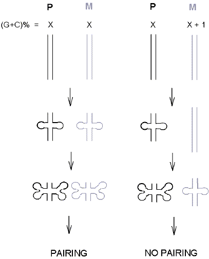 Subjects of much debate are how and why this meiotic union occurs. Crick saw the problem as one of determining how parental duplex DNA molecules, both double-stranded in accordance with the Watson-Crick model, would be able to recognize each other. For simplicity, he thought the recognition should follow the base-pairing rules that he and Watson had discerned. But in helical duplex DNA the bases were inward-looking. How could inward-looking bases in one duplex look outwards to recognize homologous bases in another DNA duplex? Thus, came the "unpairing hypothesis" (Crick, 1971). In both duplexes the two strands would locally unpair so as to present outward-looking, single-stranded, sequences of bases (Krueger et al., 2006). In this way, a segment of bases in a paternal duplex would be able to pair with a similar segment of bases in a maternal duplex. If the pairing sequences were absolutely identical (i.e. there was homology) the duplex would be considered a "homoduplex" (like the original parental duplexes). If the pairing sequences differed by as little as one base-pair, then the duplex would be considered a "heteroduplex" (Holliday, 1990; Allers and Lichten, 2001). Crick saw the unpaired strands as remaining single-stranded prior to forming a homoduplex or heteroduplex. But energetic considerations dictate that, as they "unzip" from each other, the unpaired single strands should quickly fold back on themselves to form stem-loop structures (Murchie et al., 1992; Woodside et al., 2006). This would be supported by the crowded intracellular environment where entropic contributions to the critical base-stacking interactions would be increased (Yakovchuk et al., 2006). Thus, the initiation of pairing between the parental DNA strands should involve the same "kissing" process as envisaged by Tomizawa for RNA molecules (Sobell, 1972; Wagner and Radman, 1975; Doyle, 1978; Kleckner and Weiner, 1993; Hawley and Arbel, 1993). Of key importance for this would be that the unpairing and folding displayed a sufficient degree of synchrony so complementary DNA loops would have the opportunity to meet. As in the case of RNA folding (Chen et al., 1990), it was found for DNA that base composition, rather than actual sequence similarity (base order), was critical in determining the degree of secondary structure (Forsdyke, 1998). These results, derived from thermodynamic calculations of nearest-neighbour energies (Mathews, 2006), were supported by optical force clamp studies of isolated molecules (Woodside et al., 2006). Thus, a very small difference in the base composition between the paternal and maternal DNAs should suffice to prevent the initiation of hybridization. This is summarized in Figure 2. Here, on the left, paternal (P) and maternal (M) DNAs have the same base composition ("X"). As conditions change, the two strands unpair in synchrony and loops are positioned so that kissing can occur. Formation of a paranemic joint (no immediate strand breakage) can lead to recombination (Wong et al., 1998). On the right, the base compositions differ slightly (X and X+1) and the unpairing is unsynchronized. |