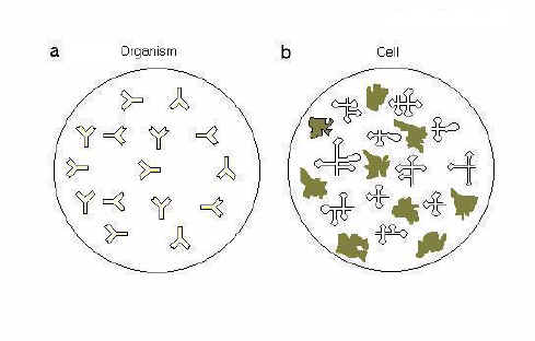 Fig. 1. The cell as an elementary immune organism. The left circle (a) represents a multicellular organism with Y-shaped antibodies of various specificities. The right circle (b) represents a unicellular organism with a repertoire of "antibody-like" protein and "antibody-like" RNA molecules (stem-loop structures) These are referred to as "immune receptors" implying that parts of these molecules can interact with intracellular antigens. |