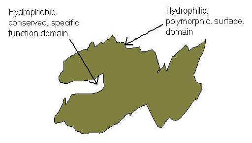 On average, the haploid maternal and paternal contributions to your diploid genome are likely to differ from each other at least once every 0.5-2.0 kilobases, and general intraspecies differences may arise at least once every 185 bases [6]. Such polymorphism should decrease the extent to which a pathogen from one host can anticipate the genomic characteristics of its next host. When the polymorphism affects proteins, it probably affects sequences of relatively low complexity that correspond to hydrophilic non-globular domains at the protein surface [7]. Thus, these domains, usually not critical for the specialized function of the protein, are available for interaction with complementary molecular patterns of intracellular pathogens ("not-self;" Fig. 2). These same domains should also have the potential to react with "self" proteins, sometimes to an extent sufficient to trigger adverse responses in the host (intracellular "autoimmune" pathology). Organisms with mutations avoiding this would have been favoured over evolutionary time [8-10]. |