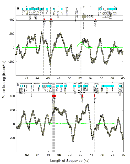 Also shown in Figure 3 are various repetitive elements with assigned potential transcription directions. Although within a class of repetitive element there is some variability, by definition the repetitive elements themselves tend to diminish genome variability. However, the regions downstream of Alu elements are often devoid of other repetitive elements. For example, the pyrimidine-loaded leftward-transcribing Alu element downstream of G0S2 has a clear downstream region that retains the pyrimidine-loading of the original transcript. On the other hand, several kilobases upstream of G0S2 are two leftward-transcribing Alu elements, one of which transcribes into a region that is purine-loaded and contains repetitive elements of the L2 family. These results are illustrative of the general features of this genomic region. A parallel study of the region of a much smaller human chromosome containing the FOSB/G0S3 gene (chromosome 19; [27]), revealed a much tighter packing of repetitive elements (data not shown). |