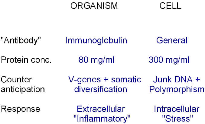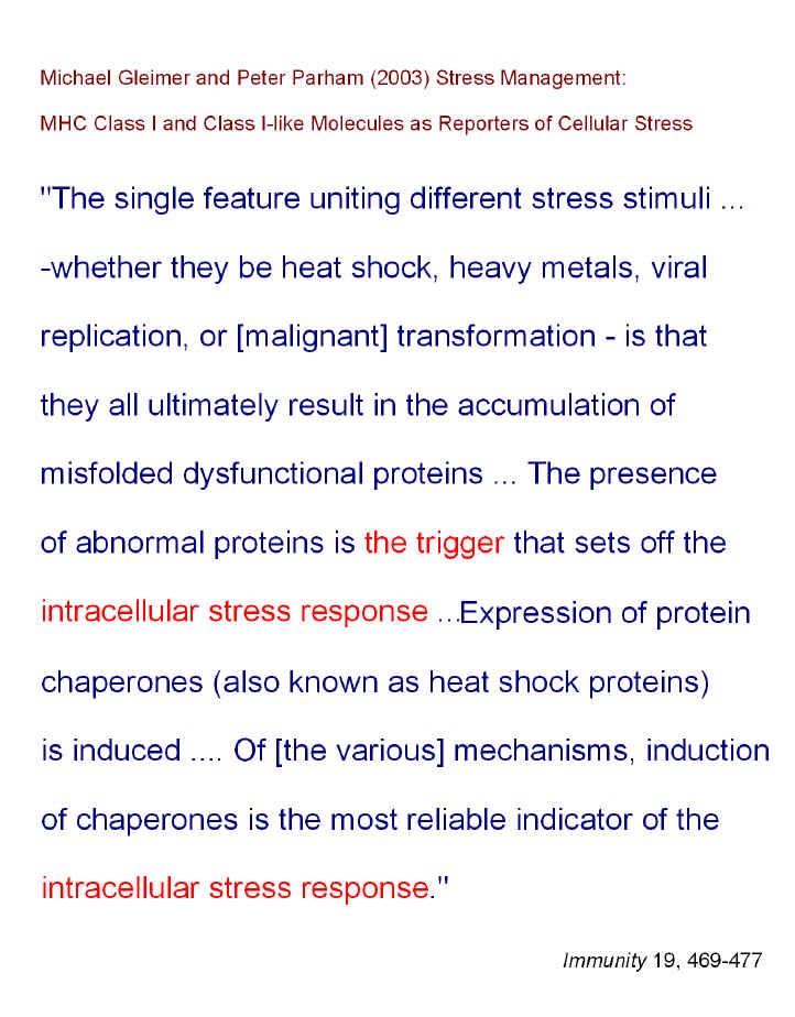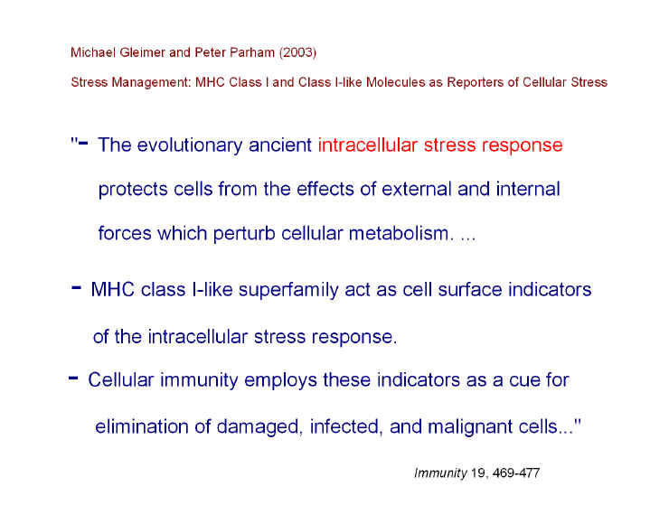 We have proposed that when cells are stressed (e.g. pathogen, tumor, heat-shock), junk DNA is transcribed from the "hidden transcriptome," by run-on transcription of normal genes and Alu repetitive elements. The RNA so formed may form dsRNA, so activating intracellular alarms, or be translated to generate proteins from which peptides are derived. Stress-induced transcription of a particular transcript at a critical developmental stage could produce "phenocopies" (Goldschmidt) not reflective of the genotype that is normally selectively expressed in a particular tissue. For further background please see [these web-pages]. |