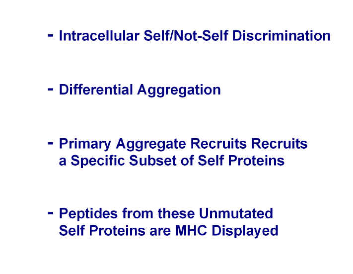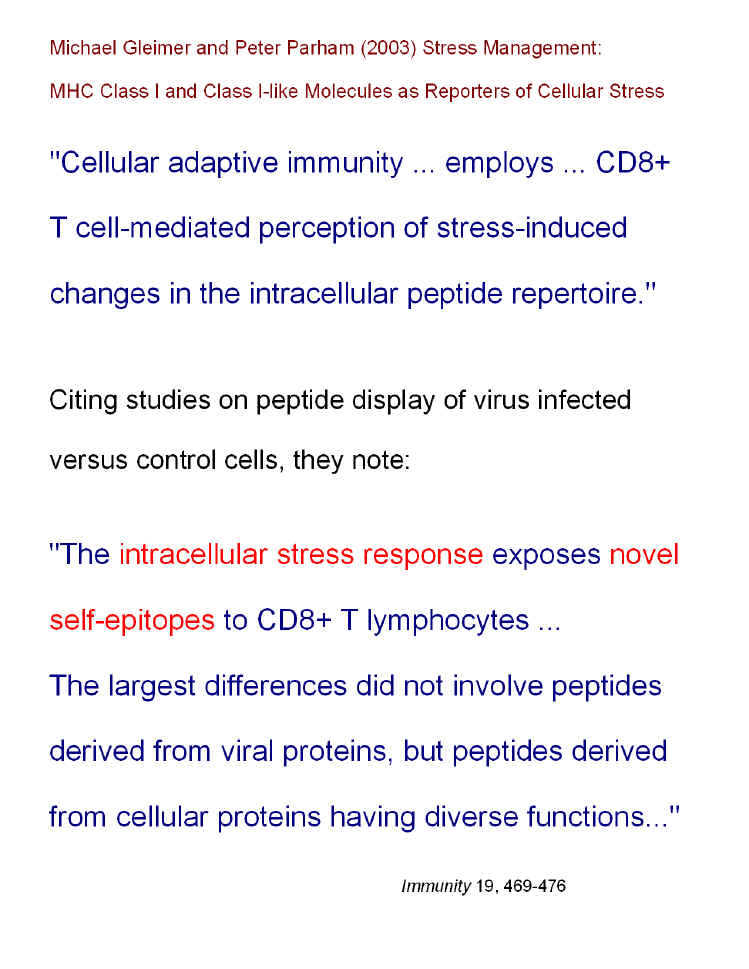 At previous conferences I presented evidence for the hypothesis that the crowded cytosol constitutes an environment supporting the presentation to T-cells, as MHC-peptide complexes, of peptides from normal, rather than mutated, intracellular self proteins ( Cell Stress & Chaperones 1999, 4:205; 2000, 5:375; J. Theor. Biol. 2001, 210:425; Trends Immunol. 2002, 23:575). At the fourth conference, some of the evidence that has appeared in the interim will be reviewed. For example,
