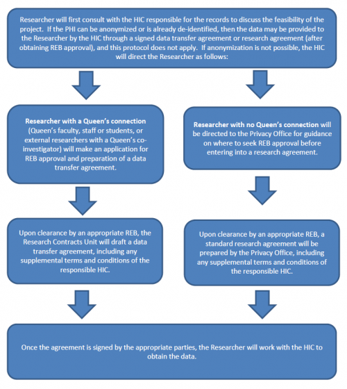 The flow chart below outlines the process for accessing records containing personal health information from a Queen’s University HIC. Researchers with a connection to Queen’s University will follow the normal process for approval through a research ethics board with the goal of obtaining a data transfer agreement. Researchers without a connection to Queen’s University will apply through the University’s Privacy Office with the goal of obtaining a research agreement.