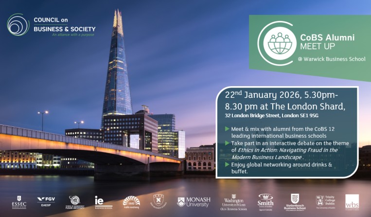 Join your alumni peers from the 12 leading business schools that make up the Council on Business & Society (CoBS) alliance: ESSEC Business School, FGV EAESP, School of Management Fudan University, IE Business School, IIM Bangalore, Keio Business School, Monash Business School, Olin Business School, Smith School of Business, Stellenbosch Business School, Trinity Business School, Warwick Business School.