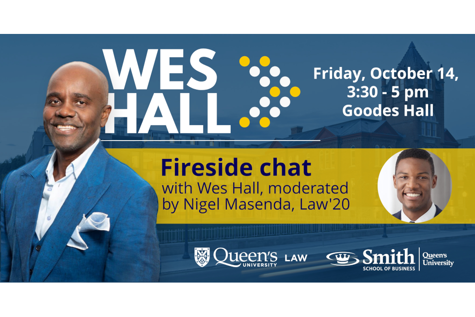 On October 14, Queen’s University is excited to welcome Canadian business leader Wes Hall for a special fireside chat, moderated by Nigel Masenda, Law’20, with remarks from Dean Mark Walters, Faculty of Law, and Dean Wanda Costen, Smith School of Business.