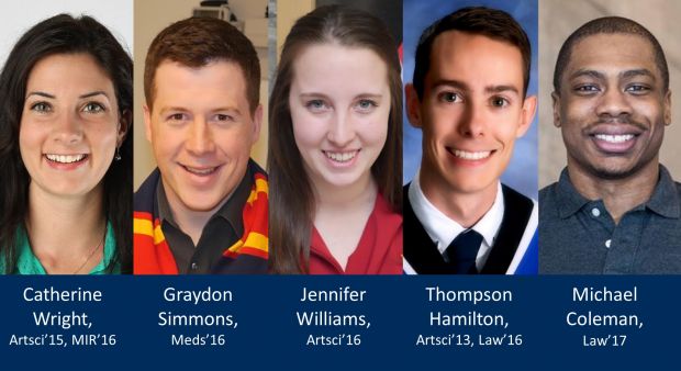 Thompson Hamilton, ArtSci’13, Law’16, Michael Coleman, Law’17, Catherine Wright, ArtSci’15, MIR’16, Graydon Simmons, Meds’16, and Jennifer Williams, ArtSci’16, will officially be inducted into the Tricolour Society at a ceremony on April 2.