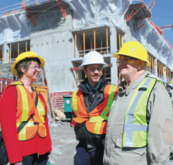 Writer Kirsteen MacLeod, Journal sports editor Andrew Bucholtz, Artsci’09 (centre), and Professor Stewart Fyfe, Arts’49, on their recent tour of the Queen’s Centre construction site.