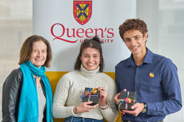 Vice-Provost and Dean of Student Affairs Ann Tierney with Ayden Harrison and Aidan Sander, who were accepting a Peer Leadership Award for the Queen's local committee of World University Service Canada (WUSC).