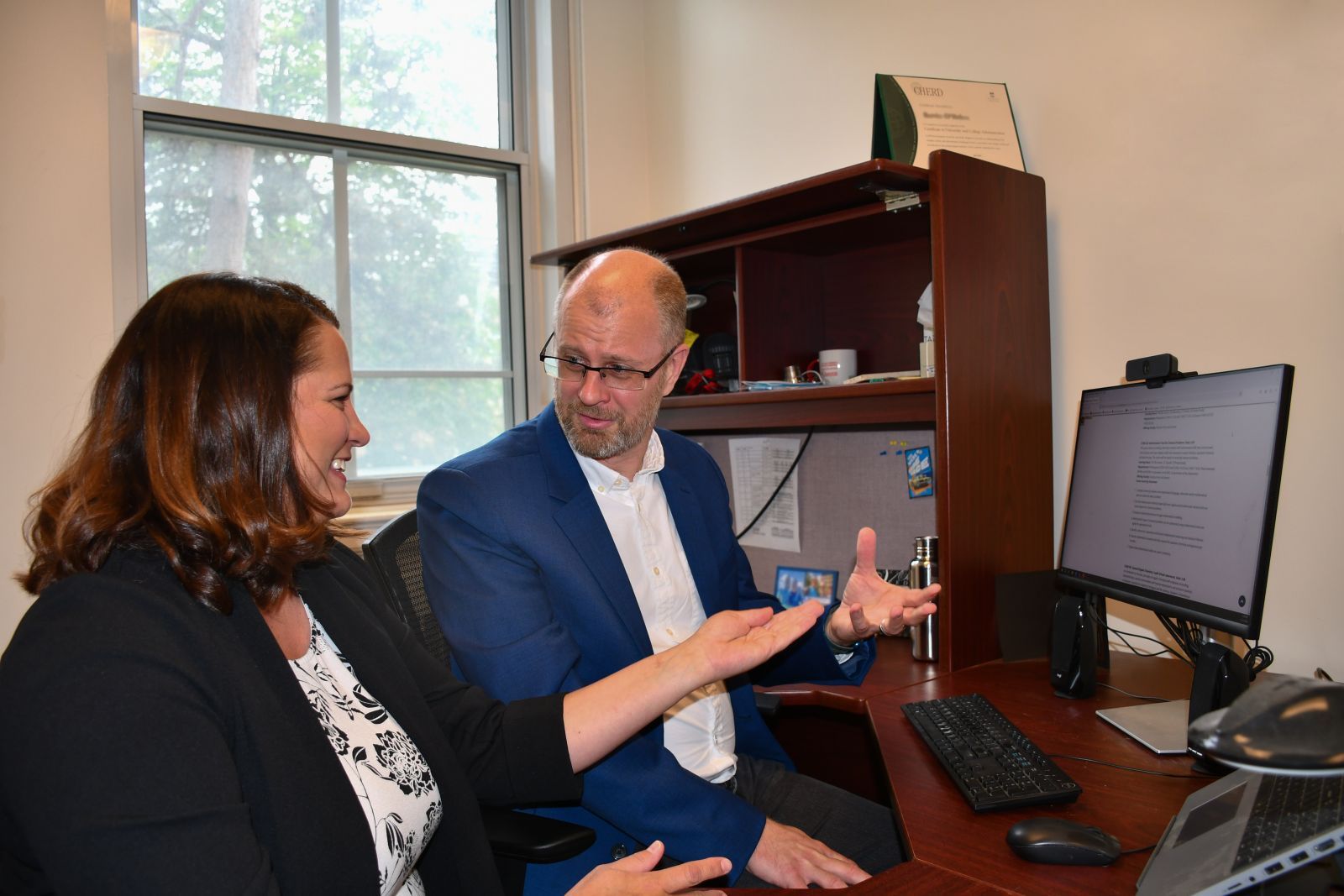 Kevin O’Brien, FAS Associate Director, Student Services (Registration, Admissions, and Service) discusses the project with Meghan Hatch, Project Manager, FAS.