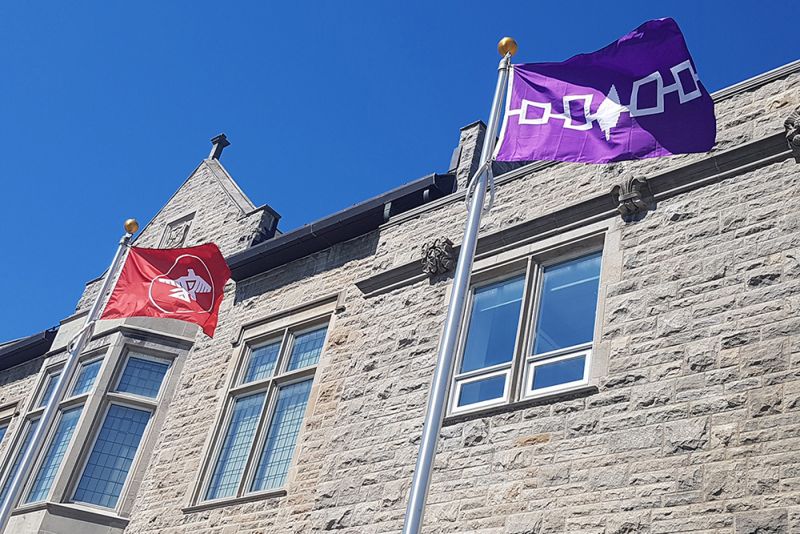 The Anishinaabek and Haudenosaunee flags were raised in front of Richardson Hall in recognition of National Indigenous Peoples Day and Queen’s University’s Indigenous community members, as well as in honour of the traditional lands on which the institution sits.