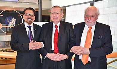 The inaugural Walter A. Szarek Lecture was delivered by Sir Fraser Stoddart at Queen's University on Friday, April 13, 2018. Attending the lecture were, from left, Mario Pinto, President of the Natural Sciences and Engineering Research Council of Canada (NSERC), Dr. Szarek, and Sir Fraser Stoddart.