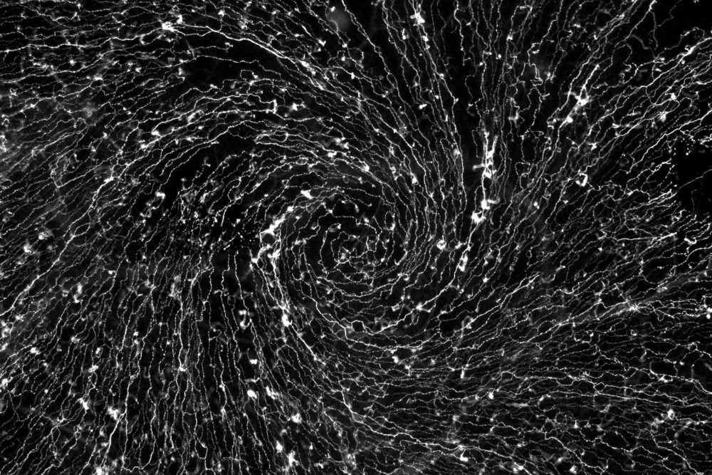 This image shows the structural βIII-tubulin component of mouse corneal nerves at their unique convergence point.