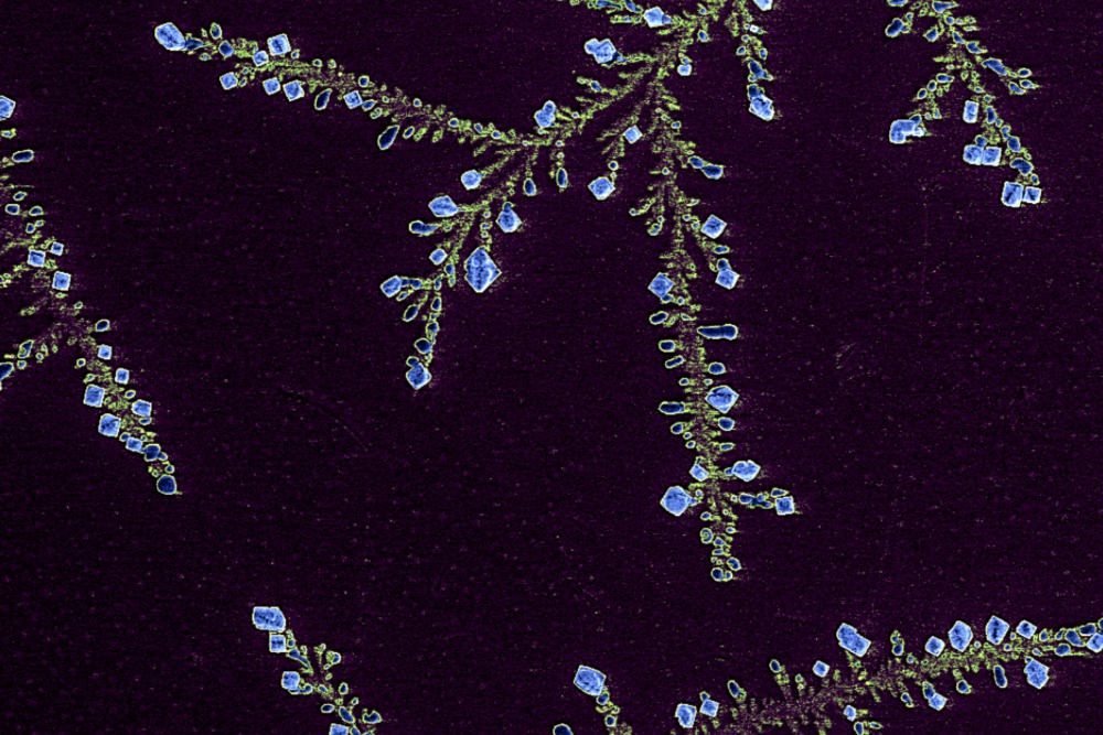 Lithium-ion batteries (LIBs) are rechargeable energy carriers that power electronic devices such as phones, cars, and hybrid/electric vehicles. The demand for lithium used to manufacture LIBs is expected to grow 30-fold by 2040. Industry primarily extracts lithium from rock ore and brine; however, the methods used are time-intensive and costly. Therefore, we are investigating alternative extraction methods that would reduce the energy consumption, waste production, and time intensity. The image, obtained by microscopy, is of salts that crystallized after evaporation of a lithium-containing brine.