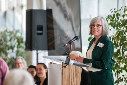 Marg Foster, the niece of Isabel Bader, welcomes attendees of the 10th anniversary celebration on behalf of Bader Philanthropies and the Bader and Overton families. (Queen's University/Garrett Elliott Photography)