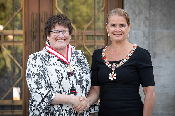 Wendy Craig (Psychology) is congratulated by Governor General Julie Payette after being appointed an Officer of the Order of Canada. (Photo: Sgt Johanie Maheu, Rideau Hall)