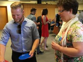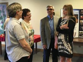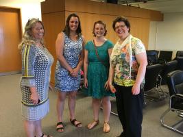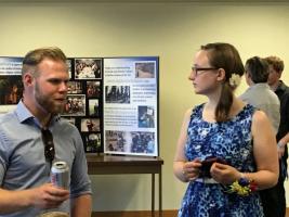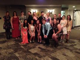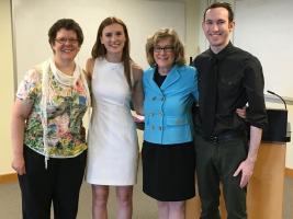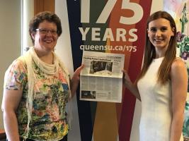 The 2016 recipients of the Herman Tracy Book Prize in Classics, Cassie Petersen and Meghan Vaillancourt, holding a photo of Herman Tracy, Queen's Classics professor from 1929 to 1961 and head of the department from 1934 to 1961.