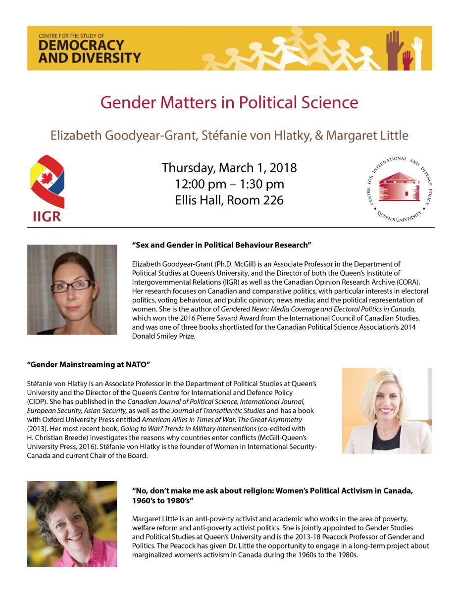 Panel: "Gender Matters In Political Science" with Elizabeth Goodyear-Grant, Stefanie von Hlatky, & Margaret Little DateThursday March 1, 2018 12:00 pm - 1:30 pm Location Ellis Hall, Room 226 Event Category Events Panels and Roundtables "Gender Matters in Political Science" Poster (PDF, 230KB)