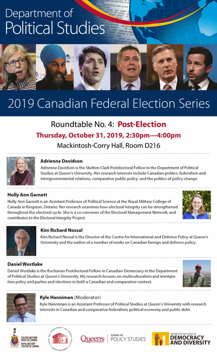 Speaker Series: 2019 Canadian Federal Election Series Roundtable No. 4: Post-Election DateThursday October 31, 2019 2:30 pm - 4:00 pm Location Mackintosh-Corry Hall, Room D216 Event Category Events Panels and Roundtables Speaker Series 2019.10.31 - 2019 Canadian Federal Election Series - Roundtable No. 4: Post-Election (PDF, 1,010KB)