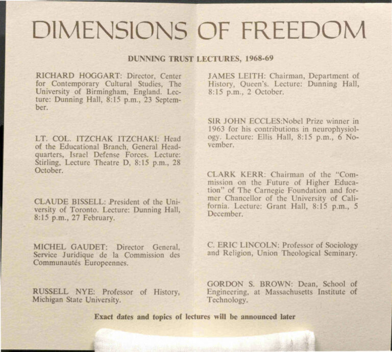 In his lecture, Bissell addressed the increasingly prominent demands from students for a voice in university affairs. While he celebrated the potential of student participation to enliven the community, making the institution more sympathetic to innovation, new curricula, and awakening an interest in the analysis of the university as an institution, he also argued that student activists’ “naive attachment to an anti-intellectual, authoritarian point of voice and their acceptance of violence may have grim consequences.” While traditional academic freedom applied to faculty, Bissell saw a new concept of academic freedom that applied principally to the student emerging. Increasingly, freedom for the student was the power to make decisions about their environment and to be protected against institutional coercion and injustice, including the right to hear controversial speakers. The student’s concept of freedom was distinct from the traditional version, he argued, in that the impediments to freedom were now located within, not without, the institution. Students also considered tenure a form of tyranny and demanded a voice in appointments and promotions which faculty in turn believed threatened their concept of academic freedom. Ultimately, the university needed to decide how to resolve the issue, as student activism, while laudable for its emphasis on freedom as a moral and intellectual value, had the potential to undermine the “whole structure of the university.”