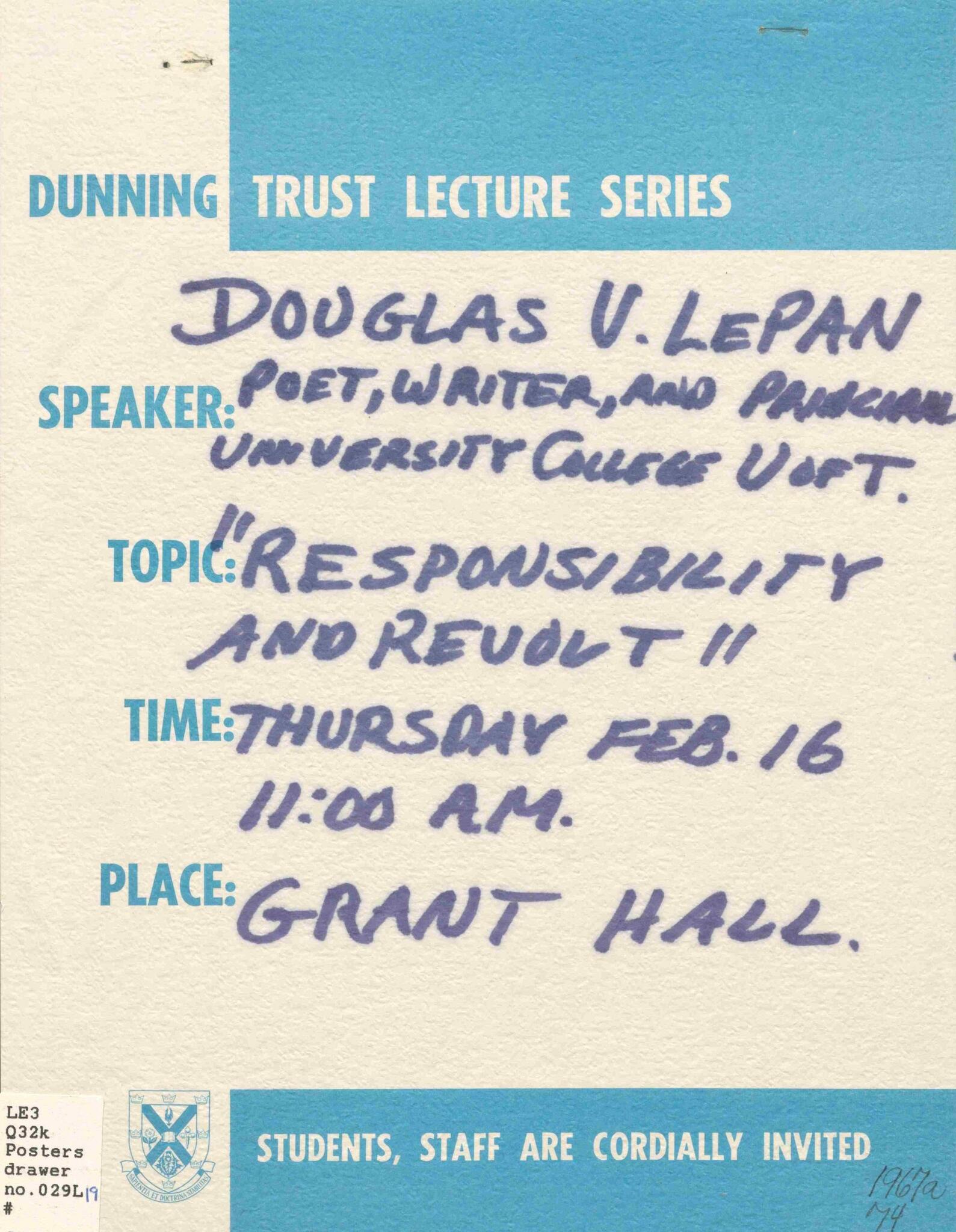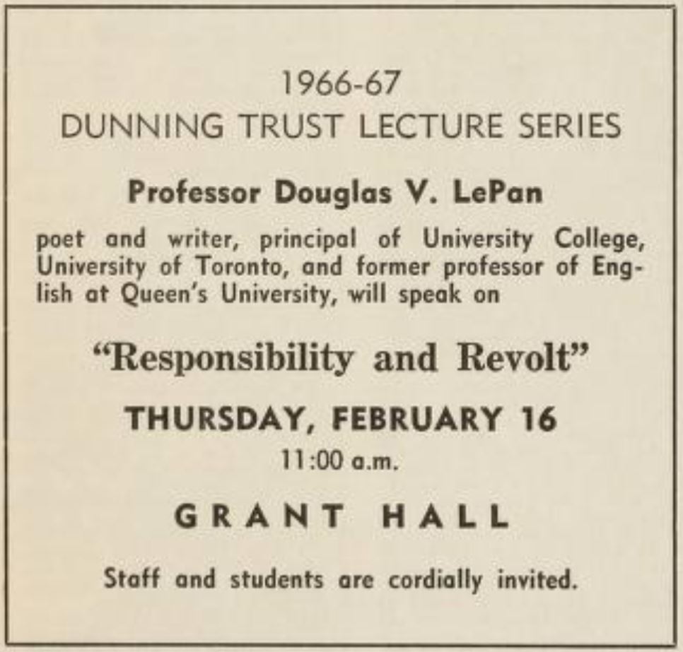 In his lecture, LePan argued that the erosion of the moral bases of authority undermines responsibility and discredits those in positions of authority, robbing government of its effectiveness and authenticity. LePan described how the fast pace of modern change resulted in authorities resorting to numerical analyses and predictions based on data to inform their decisions, reducing human problems to statistical terms No models, he argued, could ever duplicate the fullness of human life. The reliance on data had created suspicion of those in power among ordinary citizens who perceived that the process of analyzing modern problems compromised their humanity by reducing them to series of numbers. From there, LePan turned to address the increasing spirit of revolt among the youth of the day: in the mid-1960s, he perceived, youth had gained a kind of cultural currency, and so had revolt. This revolt was not to substitute one social order for another, but rather a revolt against all forms of organized society. LePan ended by considered what was required of both the ruled and the rulers. The ruled, he suggested, needed to avoiding asking for too much from their government – by this, he didn’t mean an end to the provision of social security benefits or welfare, but rather that citizens needed to recognize the point at which the state or government could no longer intervene to improve human life meaningfully. The rulers, he thought, needed to see their task as creating a human environment that would allow all to reach their potential. This would require and support “an image of man, the critic and master of nature, and yet its finest testimony, with each of his organs bound oracularly to the cosmos as they appear in the old almanacs.”