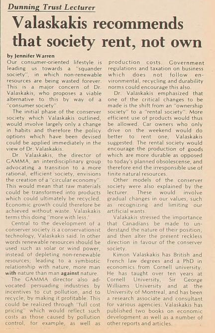 Valaskakis’ lecture focused on the process of developing the Conserver Society as a policy option in Canada. At the Gamma Institute, a team of 15 experts from 10 different fields conducted research into Canadians’ relationship with the environment and produced four reports outlining both the dangers of continuing with our current mass consumption society, as well as several concrete ways to move towards a more responsible society. Since the immediate postwar period, the affluent society had put forward two commandments: thou shalt consume and thou shalt grow. The danger of this growth and consumption-oriented mindset, Valaskakis explained, was that it led easily into what he called the “squander society,” where resources were used so inefficiently that over time we came to do less with more. The Conserver Society sought to reorient this – to do more with less. In the remainder of his talk, Valaskakis outlined three potential scenarios for the implementation of the Conserver Society paradigm. Ultimately, the Conserver Society proposed by Gamma attempted to move beyond the negativity of the Club of Rome’s Limits to Growth to make a positive statement about the potential of conservation, to make environmental responsibility exciting, interesting, and a desirable insurance policy for the future.