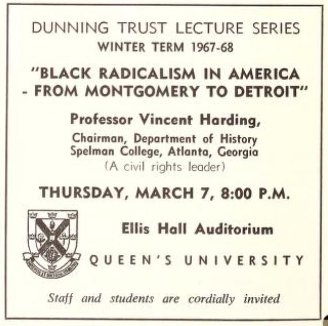 In his Dunning Trust lecture, Harding described the situation of the Civil Rights Movement in the United States, especially the growing belief that armed liberation struggle was the solution to inequality. Despite SCOTUS rulings to end segregation and the Civil Rights Act, and despite attempts to protest ‘politely’ in the March on Washington, anti-Black racism remained a strong force in American society. The summer of 1967, Harding said, showed that radical violence could immobilize major cities and, under the leadership of men like Stokely Carmichael, force progress where more moderate actions hadn’t. As an admirer of Malcolm X, Harding articulated his belief that there was a need for direct and immediate action to further racial equality, quoting Langston Hughes’ question “what happens to a dream deferred? Does it rot or does it die or does it explode?