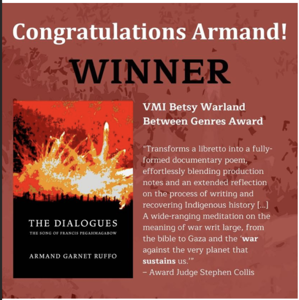 Congratulations to English professor Armand Garnet Ruffo for his VMI Betsy Warland Between Genres Award for "The Dialogues."