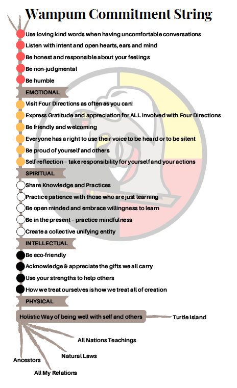 The Wampum Commitment String was created in fall 2019 to represent the values of the Indigenous community at Queen’s and act as an outline for how individuals are expected to conduct themselves in the centre.