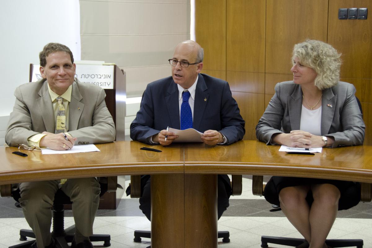 Principal Daniel Woolf, Joseph Klafter, President of Tel Aviv University, and Elizabeth Cannon, President of the University of Calgary, after signing an agreement that will allow for more collaboration between universities in Israel and Canada.Principal Daniel Woolf visited Israel and the West Bank this week as part of a delegation of six university presidents to the region. Yesterday, the Association of Universities and Colleges of Canada (AUCC) signed a five-year memorandum of understanding with the Association of University Heads, Israel (AUH) in a bid to strengthen ties between academic institutions in the two countries.