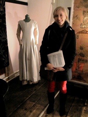 Johanna Amos at the Red House in London where William and Jane Morris lived at one time. Ms. Amos is standing beside one of the modelling costumes that was likely worn by Jane Morris.“Knowing that I would be able to do this project properly because of the Bader Travel Fellowship was really influential because otherwise I likely would have studied in the U.K. to be closer to the material,” she says.