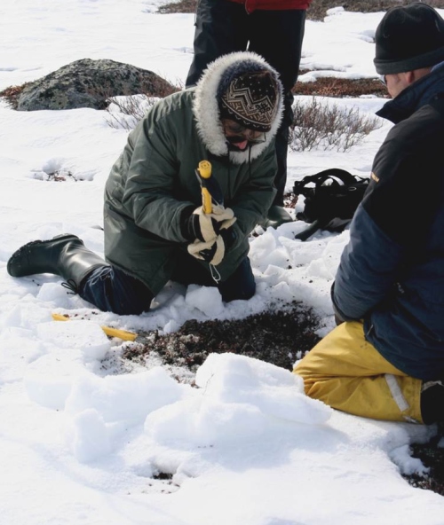 Virginia Walker removes soil samples from the Arctic tundra.“Through this research we have seen that four different measures of soil analysis point to the same result: the addition of nanosilver interferes with normal seasonal change in the Arctic tundra,” says Dr. Walker.