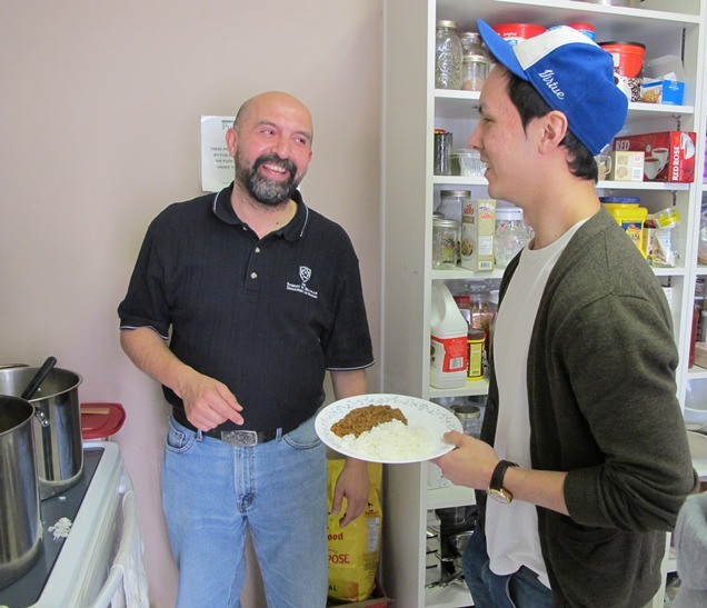 Deputy Provost Laeeque Daneshmend hands Ben Robertson (Sci'14) a dish of keema during the most recent feast hosted by Four Directions Aboriginal Student Centre. (University Communications)Deputy Provost Laeeque Daneshmend and Peggy Watkin, Senior Associate, Office of the Provost and Vice-Principal (Academic), were the guest chefs for the feast hosted by Four Directions Aboriginal Student Centre (FDASC) on April 16. They prepared keema, a traditional South Asian beef dish, and daal, a lentil dish.