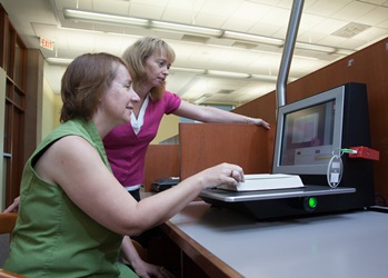 Katie Legere, Systems Coordinator at the library, operates the high speed book scanner as Kim Bell, Reserve Services Co-ordinator, looks on.While faculty are able to manage the entire e-reserve process themselves, the Library also offers a full service option to locate and post course materials to the e-reserve system for instructors. If book chapters are required, a new high-speed book scanner is used to produce high quality scans in a fraction of the time taken by a traditional flatbed scanner or photocopier.