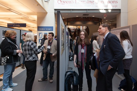 Principal Daniel Woolf speaks with students about their posters and research in Stauffer Library. The posters will be available for viewing in the library until Nov. 14.