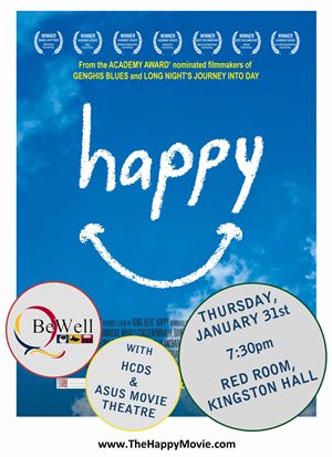 Happy will screen Thursday, January 31 at 7:30 pm in the Red Room, Kingston Hall. Admission is free and all proceeds from popcorn and drink sales will go to mental health programming at Queen’s. HCDS has also secured the educational rights to Happy and will have a copy available for group and classroom use across the university after the screening.