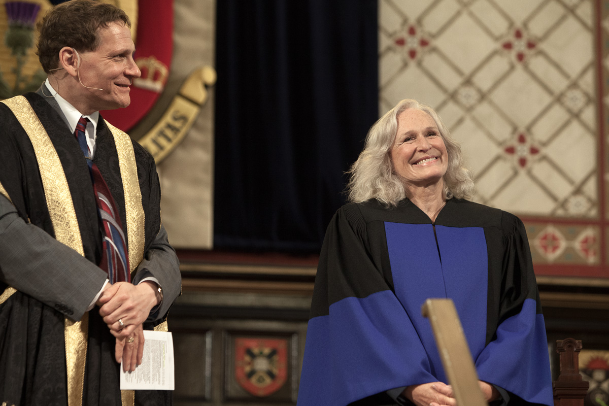 Glenn Close smiles after receiving her honorary Doctorate of Laws degree from Principal Daniel Woolf. Queen’s conferred an honorary degree on Glenn Close on Thursday, June 13, 2013. The award-winning actress and humanitarian was recognized for her work in mental health, most significantly as the co-founder of BringChange2Mind, an organization dedicated to eradicating the stigma and discrimination faced by those who struggle with mental illness. While on campus, Ms. Close gave a public lecture and met with the university’s mental health working group.