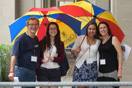 (From left to right) John Corvinelli and his daughter Rachel, and Tina Milicevic and her mother Vera, proudly show off their new Queen’s umbrellas during this year’s SOAR activities. Rachel and Tina will begin their first year of studies at Queen’s in September.Queen’s Summer Orientation to Academics and Resources (SOAR) is in full swing, with more than 1500 incoming students and their family members expected to visit campus.